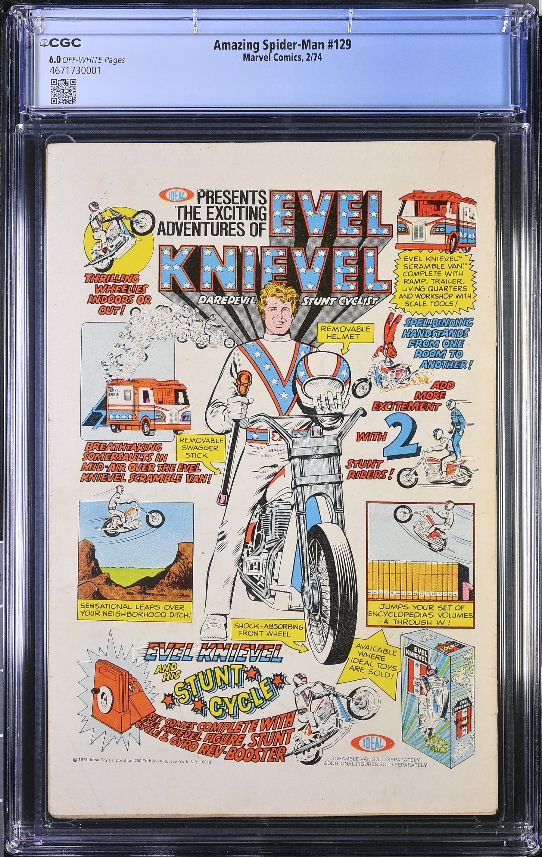 CGC Cert # 4671730001 Title Amazing Spider-Man Issue 129 Issue Date 2/74 Issue Year 1974 Publisher Marvel Comics Grade 6.0 Page Quality OFF-WHITE Grade Date 2025-12-15 Label Category Universal Art Comments Gerry Conway story, Ross Andru, Frank Giacoia and Dave Hunt art Gil Kane and John Romita cover Key Comments 1st appearance of the Punisher (Frank Castle) and the Jackal. Grader Notes multiple tear with crease full left of back cover spine stress lines breaks color crease left top of back cover staple tears
