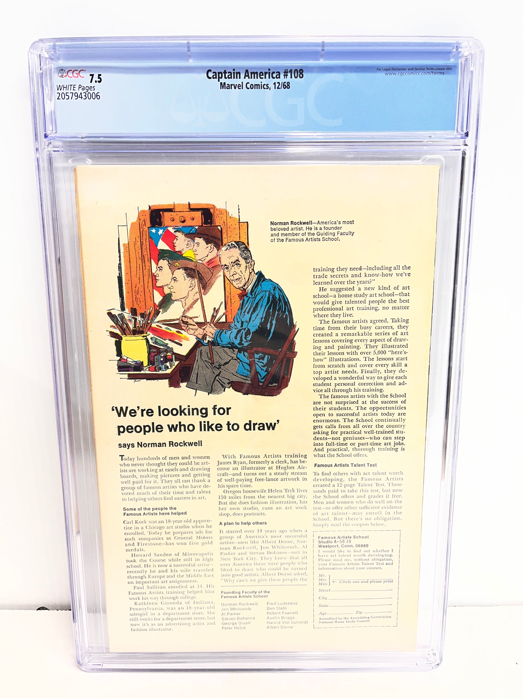 CGC Cert # 2057943006 Title Captain America Issue 108 Issue Date 12/68 Issue Year 1968 Publisher Marvel Comics Grade 7.5 Page Quality WHITE Grade Date 2019-08-05 Label Category Universal Art Comments Stan Lee story Jack Kirby and Syd Shores cover and art Key Comments Trapster appearance. Grader Notes light creasing to cover light bends to cover light spine stress lines to cover light staining to cover