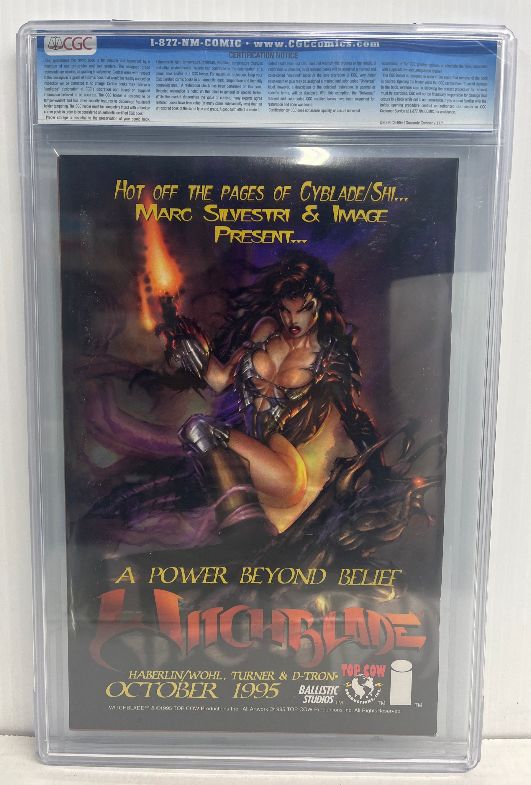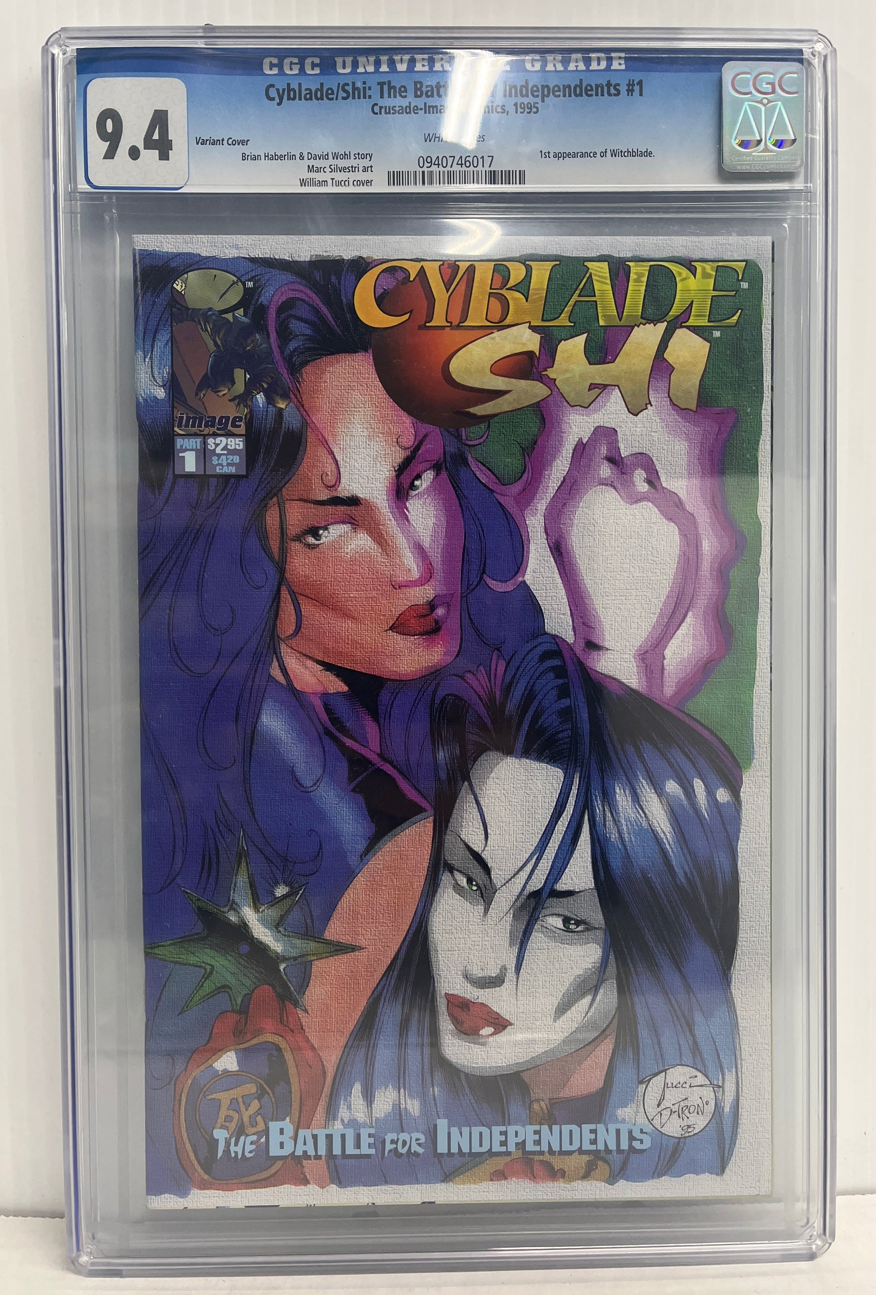 CGC Cert # 0940746017 Title Cyblade/Shi: The Battle for Independents Issue 1 Issue Date 1995 Issue Year 1995 Publisher Crusade-Image Comics Variant Variant Cover Grade 9.4 Page Quality WHITE Grade Date 2008-12-29 Label Category Universal Art Comments Brian Haberlin & David Wohl story Marc Silvestri art William Tucci cover Key Comments 1st appearance of Sara Pezzini (Witchblade).