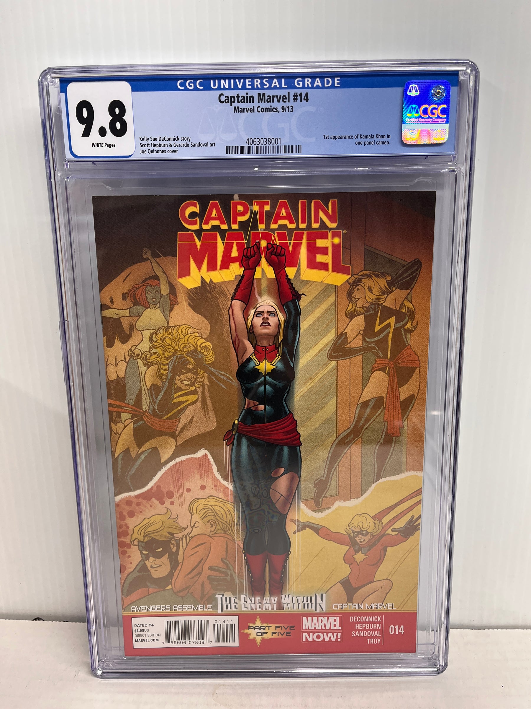 CGC Cert # 4063038001 Title Captain Marvel Issue 14 Issue Date 9/13 Issue Year 2013 Publisher Marvel Comics Grade 9.8 Page Quality WHITE Grade Date 2022-05-16 Label Category Universal Art Comments Kelly Sue DeConnick story Scott Hepburn & Gerardo Sandoval art Joe Quinones cover Key Comments 1st appearance of Kamala Khan in one-panel cameo.