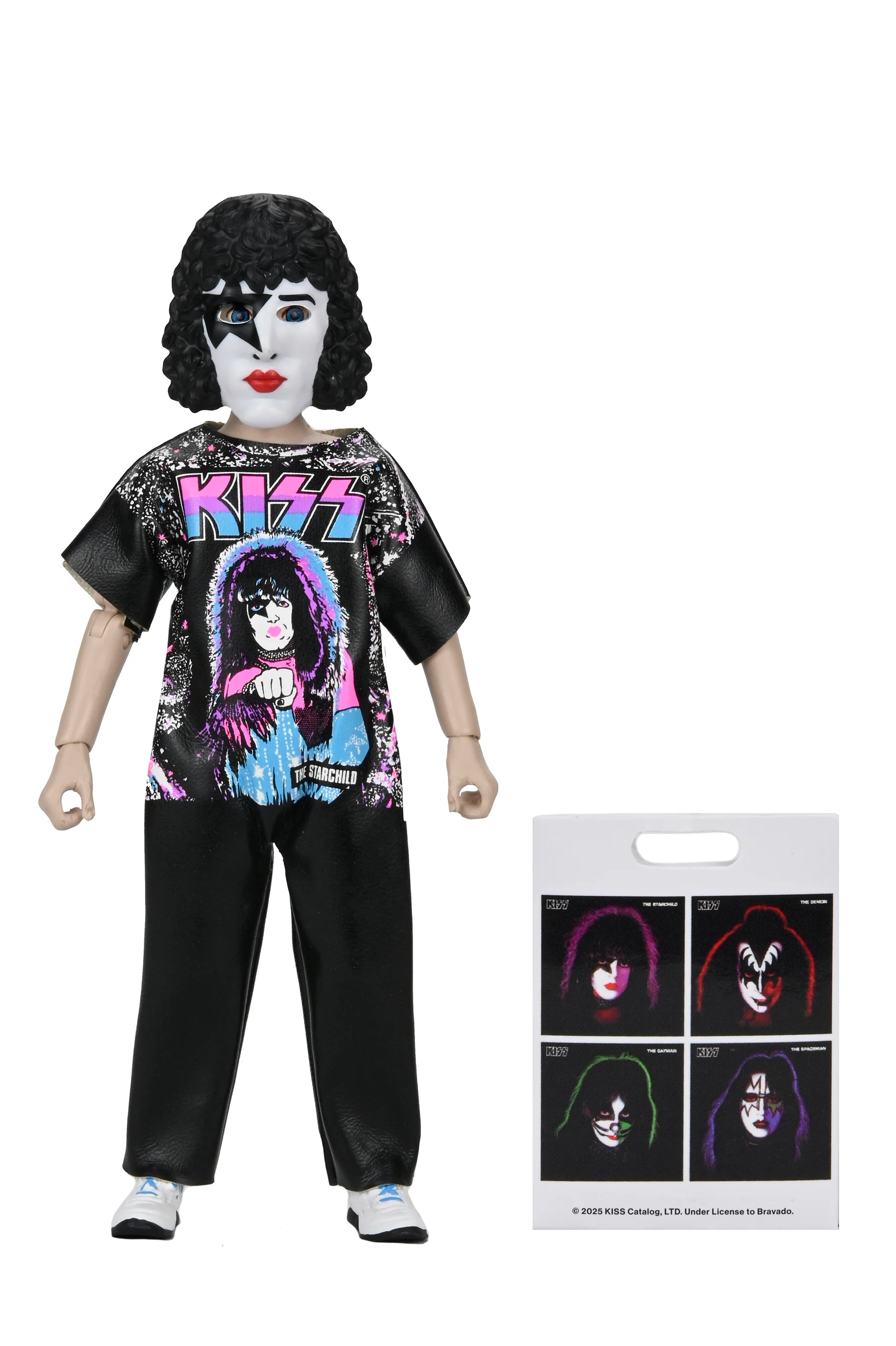Rock and roll meets retro Halloween in this electrifying addition to the Ben Cooper Costume Kids Collection! NECA celebrates the legendary band KISS with fully poseable, 6-inch figures based on the licensed kids’ costumes from two of the largest Halloween costume manufacturers from the 1950s–‘80s. Featuring faithful recreations of the original Collegeville costumes, this wave includes the Starchild, the Demon, the Spaceman, and the Catman. Each costumed action figure wears a mask and soft goods clothing replicating the signature vinyl look of the classic costumes and includes a trick-or-treat bag accessory with throwback artwork. Every figure is packaged in a numbered, retro-style window box that pays homage to the classic costume packaging.