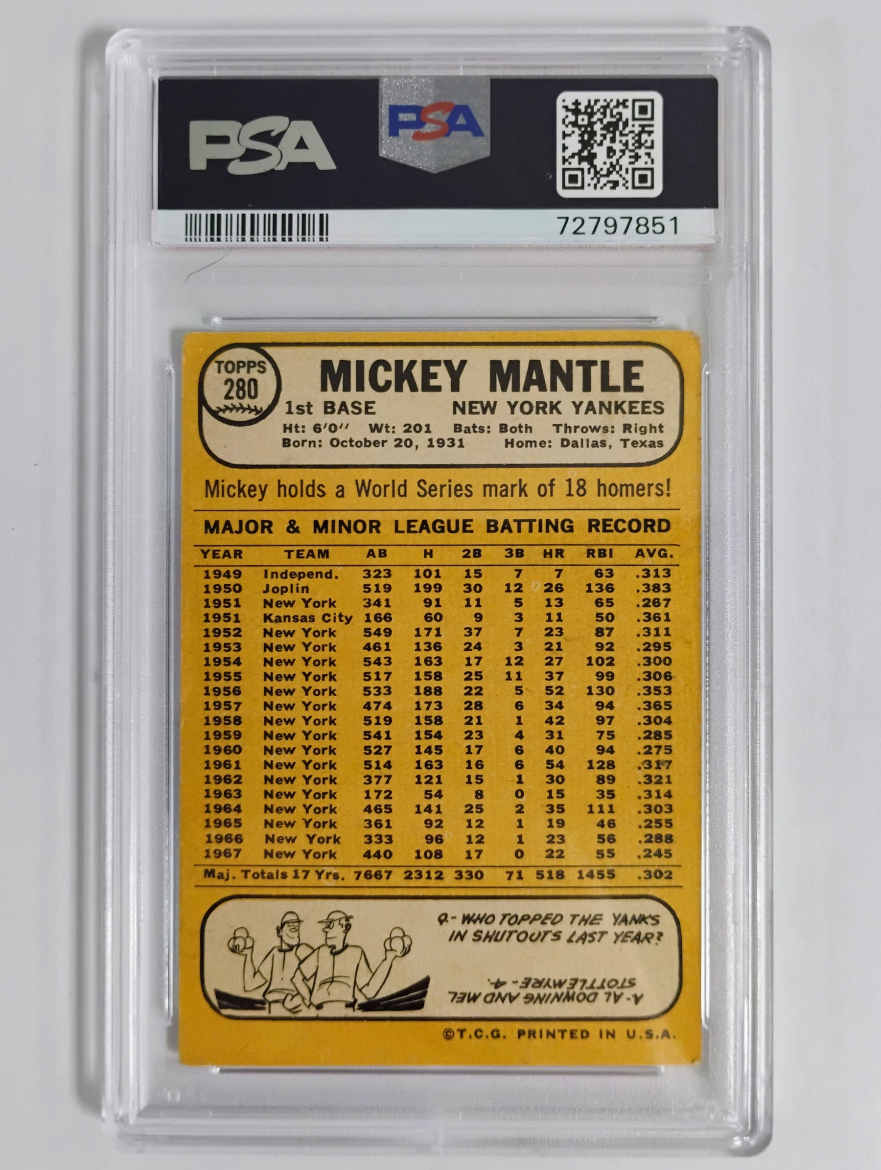 1968 Topps Mickey Mantle #280 PSA 2 Good