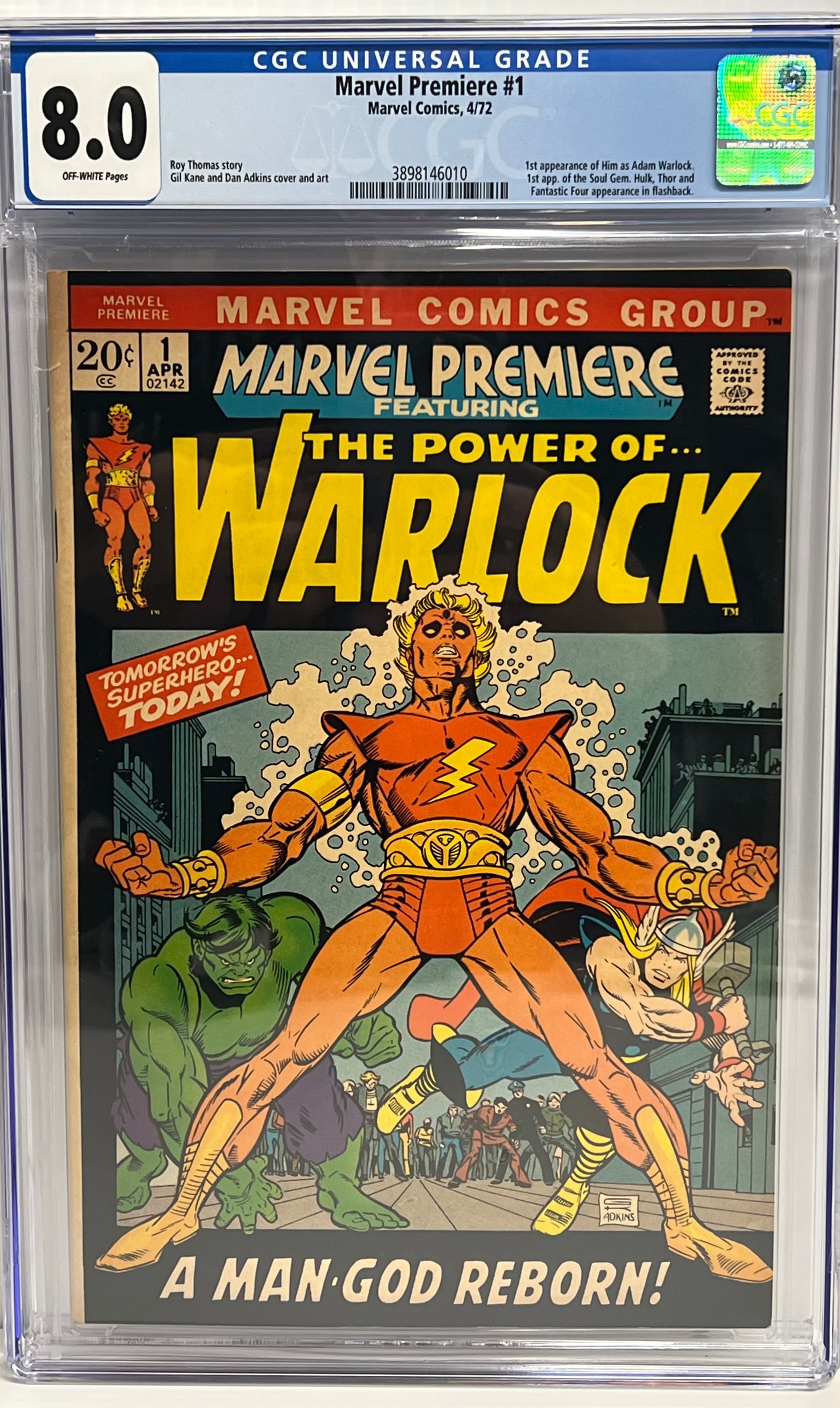 CGC Cert # 3898146010 Title Marvel Premiere Issue 1 Issue Date 4/72 Issue Year 1972 Publisher Marvel Comics Grade 8.0 Page Quality OFF-WHITE Grade Date 2022-06-13 Label Category Universal Art Comments Roy Thomas story Gil Kane and Dan Adkins cover and art Key Comments 1st appearance of Him as Adam Warlock. 1st app. of the Soul Gem. Hulk, Thor and Fantastic Four appearance in flashback. Grader Notes tanning back cover tanning interior cover light wear all corners of cover light fingerprints on cover