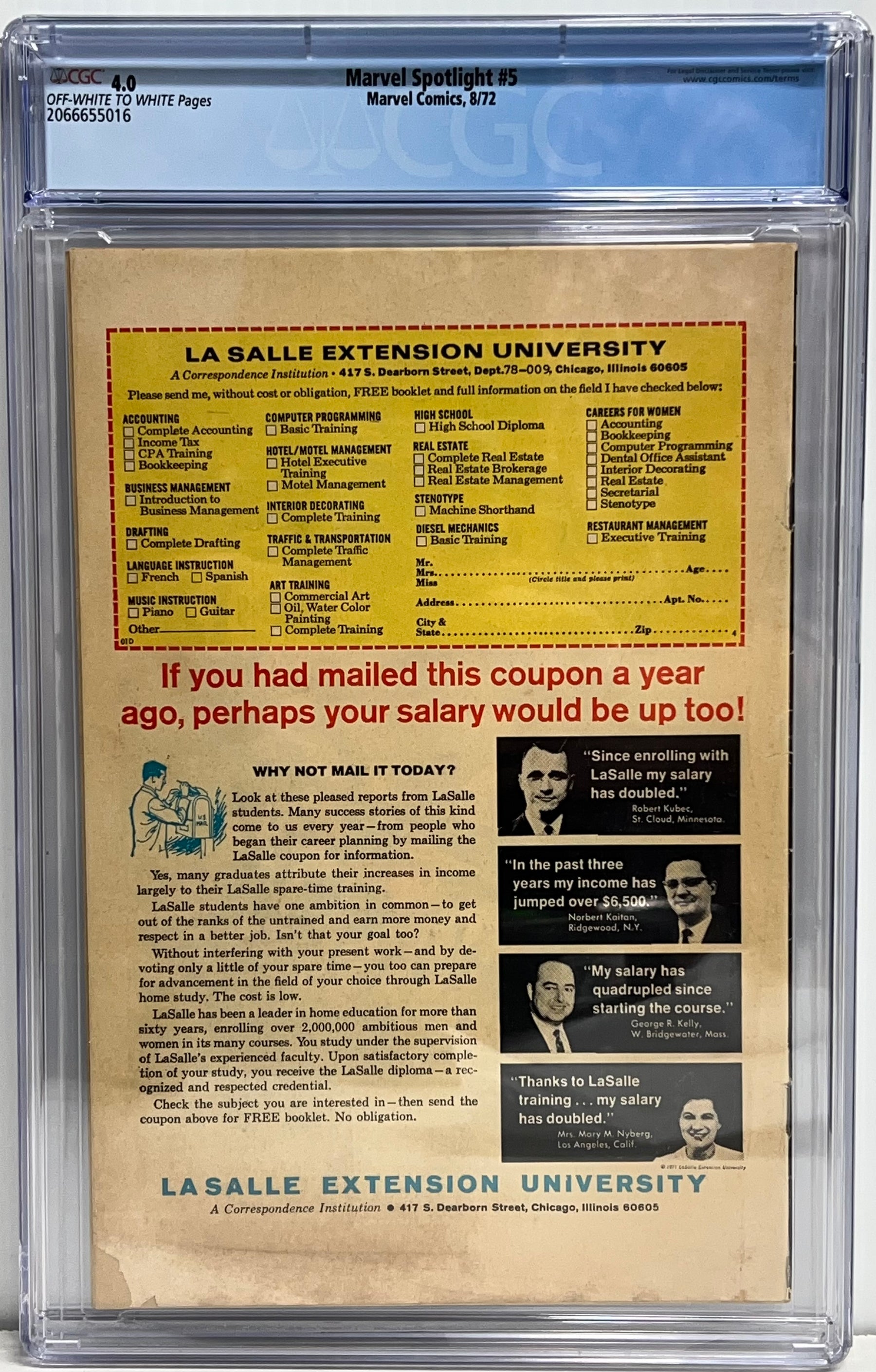 CGC Cert # 2066655016 Title Marvel Spotlight Issue 5 Issue Date 8/72 Issue Year 1972 Publisher Marvel Comics Grade 4.0 Page Quality OFF-WHITE TO WHITE Grade Date 2019-12-26 Label Category Universal Art Comments Gary Friedrich and Roy Thomas story Mike Ploog cover and art Key Comments Origin and 1st appearance of Ghost Rider (Johnny Blaze). 1st appearance of Roxanne Simpson. Grader Notes light pieces out to cover light bends to cover light spine stress lines to cover moderate staining to cover multiple crease cover breaks color