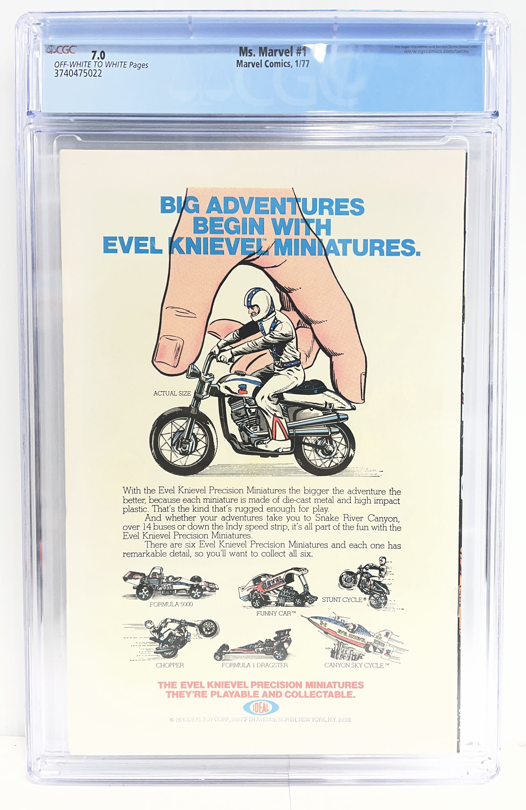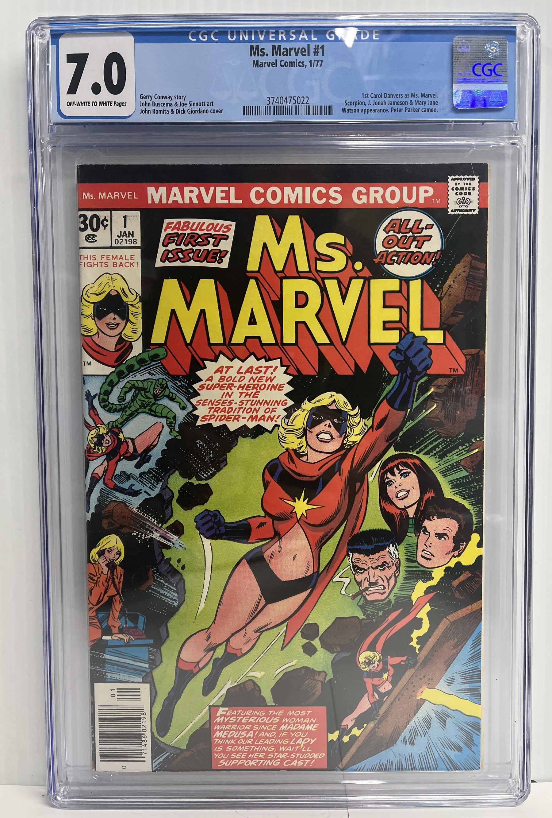 CGC Cert # 3740475022 Title Ms. Marvel Issue 1 Issue Date 1/77 Issue Year 1977 Publisher Marvel Comics Grade 7.0 Page Quality OFF-WHITE TO WHITE Grade Date 2020-11-18 Label Category Universal Art Comments Gerry Conway story John Buscema & Joe Sinnott art John Romita & Dick Giordano cover Key Comments 1st Carol Danvers as Ms. Marvel. Scorpion, J. Jonah Jameson & Mary Jane Watson appearance. Peter Parker cameo. Grader Notes moderate creasing to cover light bends to cover light spine stress lines to cover
