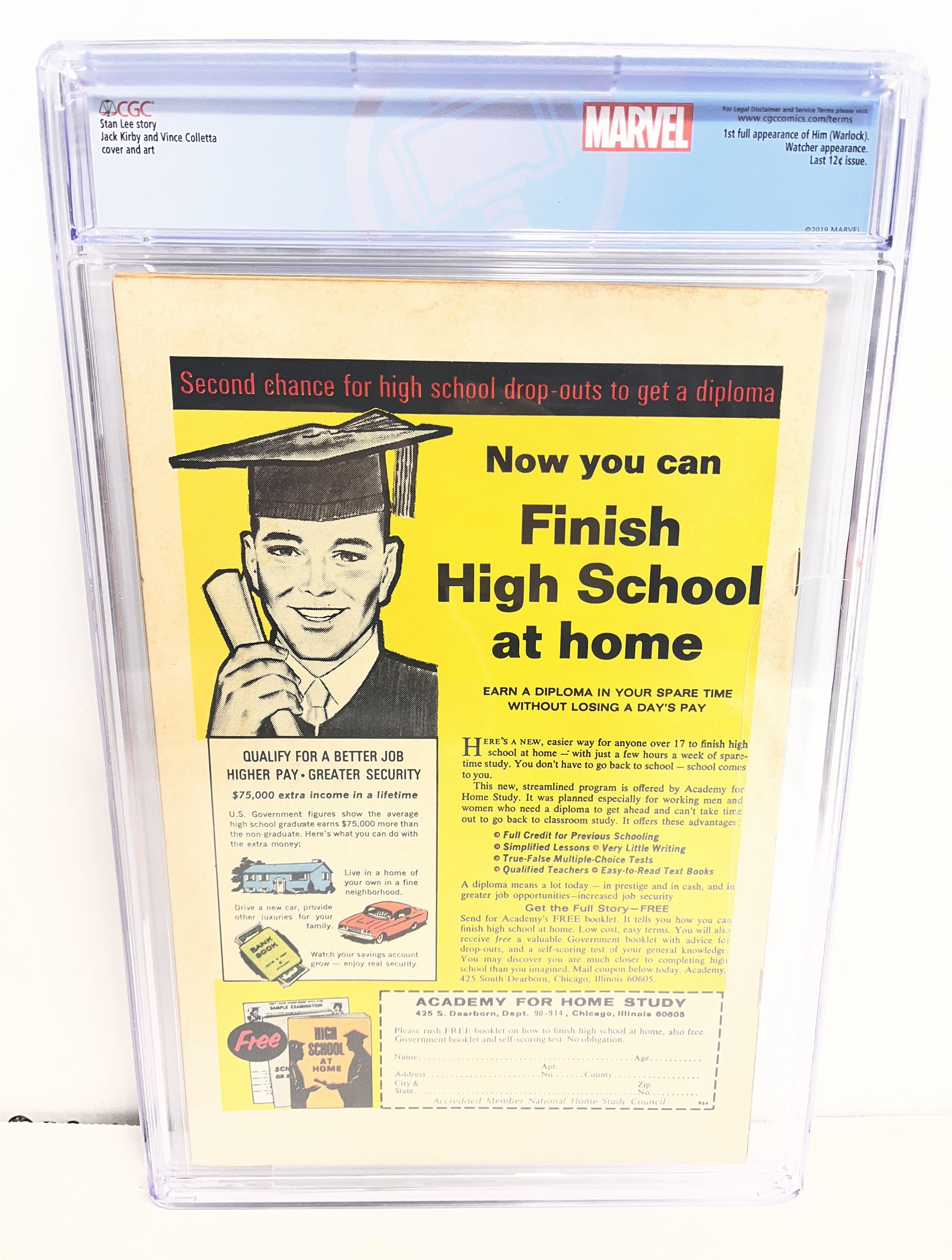 CGC Cert # 2111784001 Title Thor Issue 165 Issue Date 6/69 Issue Year 1969 Publisher Marvel Comics Grade 6.5 Page Quality OFF-WHITE Grade Date 2020-04-15 Label Category Universal Art Comments Stan Lee story Jack Kirby and Vince Colletta cover and art Key Comments 1st full appearance of Him (Warlock). Watcher appearance. Last 12� issue. Grader Notes light spine stress lines to cover light soiling on cover light wear all corners of cover very small crease right top of front cover breaks color very small crease right bottom of front cover breaks color small tear with crease right bottom of back cover breaks color