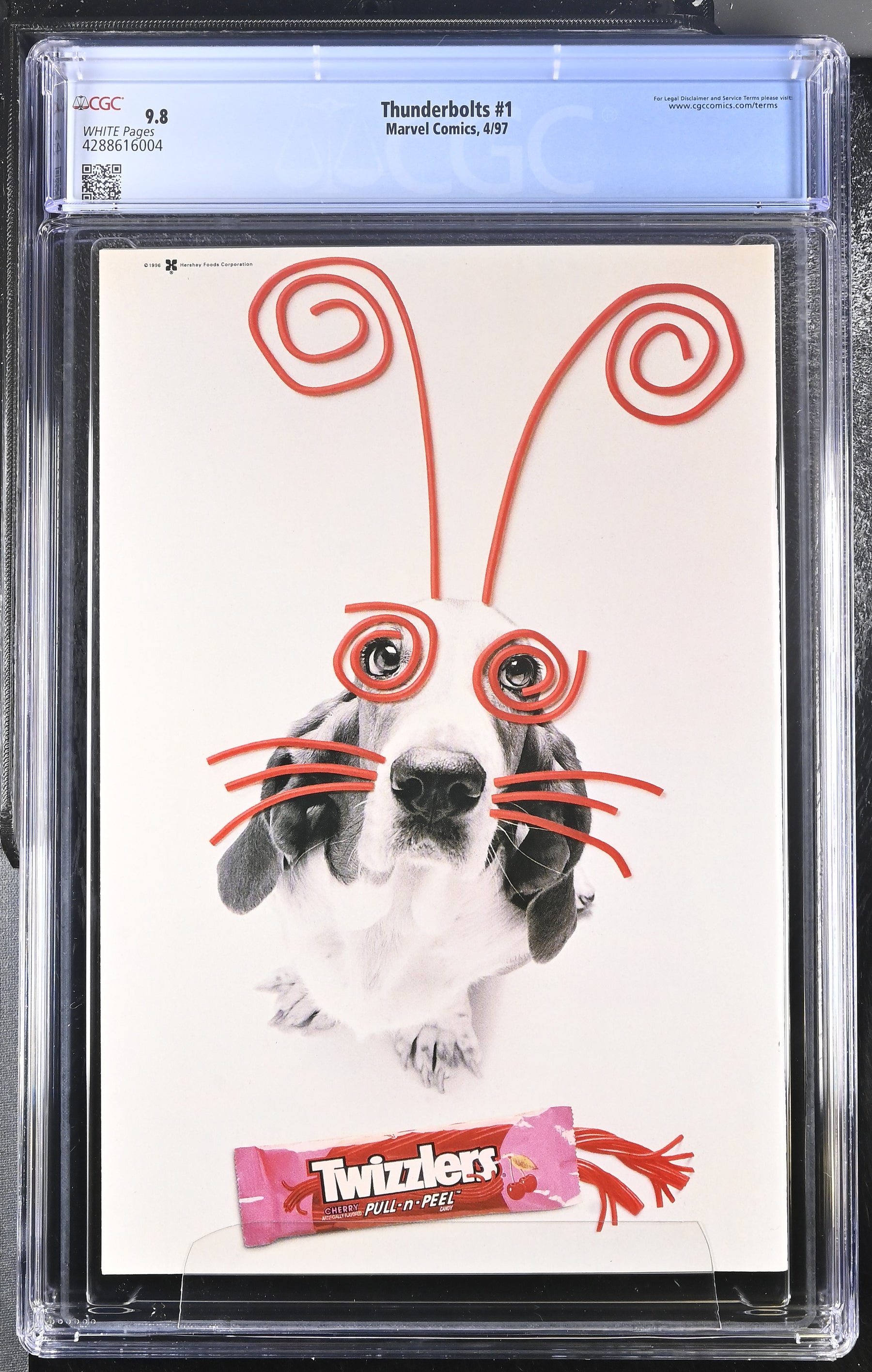 CGC Cert # 4288616004 Title Thunderbolts Issue 1 Issue Date 4/97 Issue Year 1997 Publisher Marvel Comics Grade 9.8 Page Quality WHITE Grade Date 2023-07-19 Label Category Universal Art Comments Kurt Busiek story Mark Bagley & Vince Russell cover & art Key Comments Thunderbolts revealed as the Masters of Evil. Wrecking Crew appearance. Black Widow, Spider-Man & New Warriors cameo.