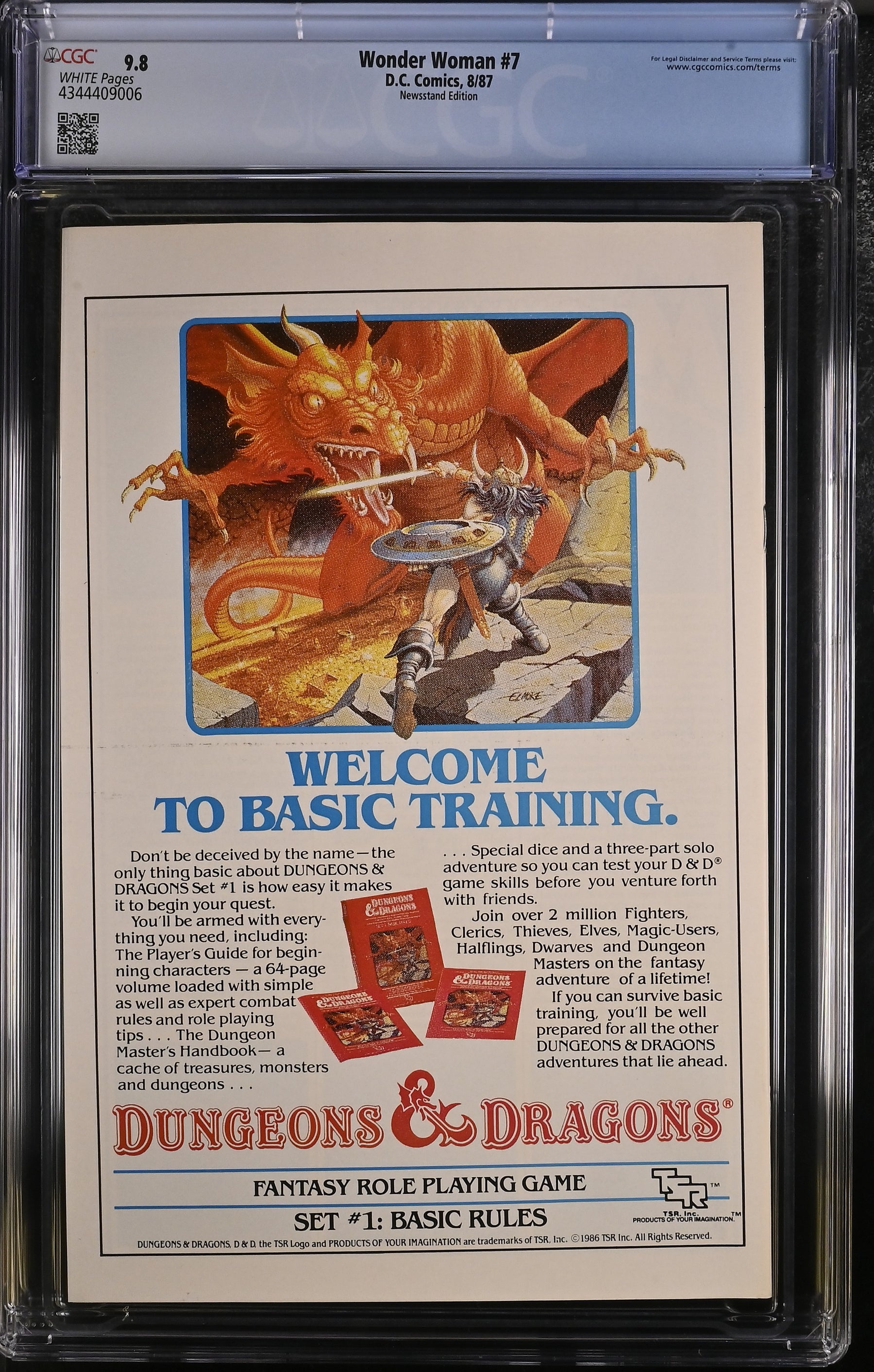 CGC Cert # 4344409006 Title Wonder Woman Issue 7 Issue Date 8/87 Issue Year 1987 Publisher DC Comics Grade 9.8 Page Quality WHITE Grade Date 2023-10-31 Label Category Universal Pedigree Newsstand Edition Art Comments George P�rez & Len Wein story George P�rez & Bruce Patterson art George P�rez cover Key Comments 1st appearance of the new Cheetah (Doctor Barbara Ann Minerva).