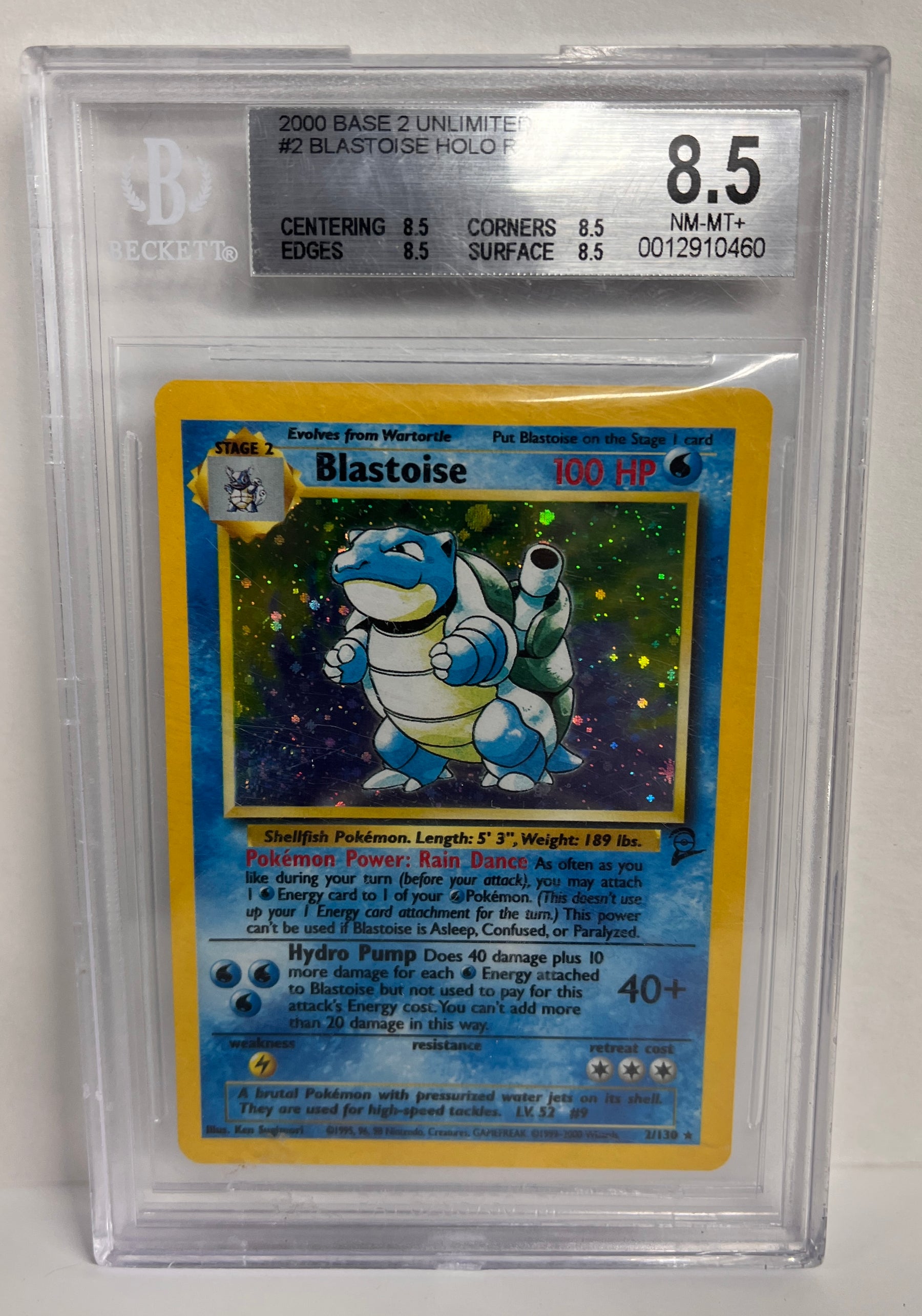 Pokemon 2000 Base 2 Unlimited #2 Blastoise Holo R Beckett 8.5 NM-MT