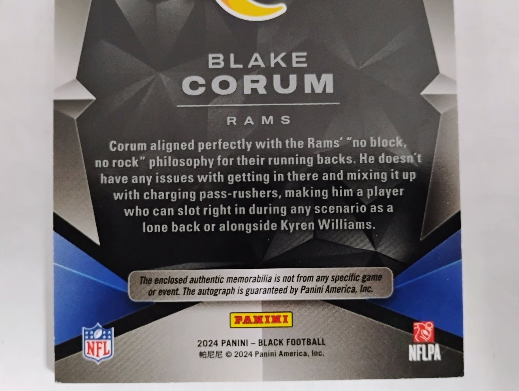 2024 Panini Black Football Blake Corum RC Auto/Patch #'D 135/150 NM-Mint No Creases NM-Mint Light Chipping Lower Left Corner, Light Chipping Lower Left & Right Back Corners Bright Yellow & Blue Patch Make this Card Pop!!!