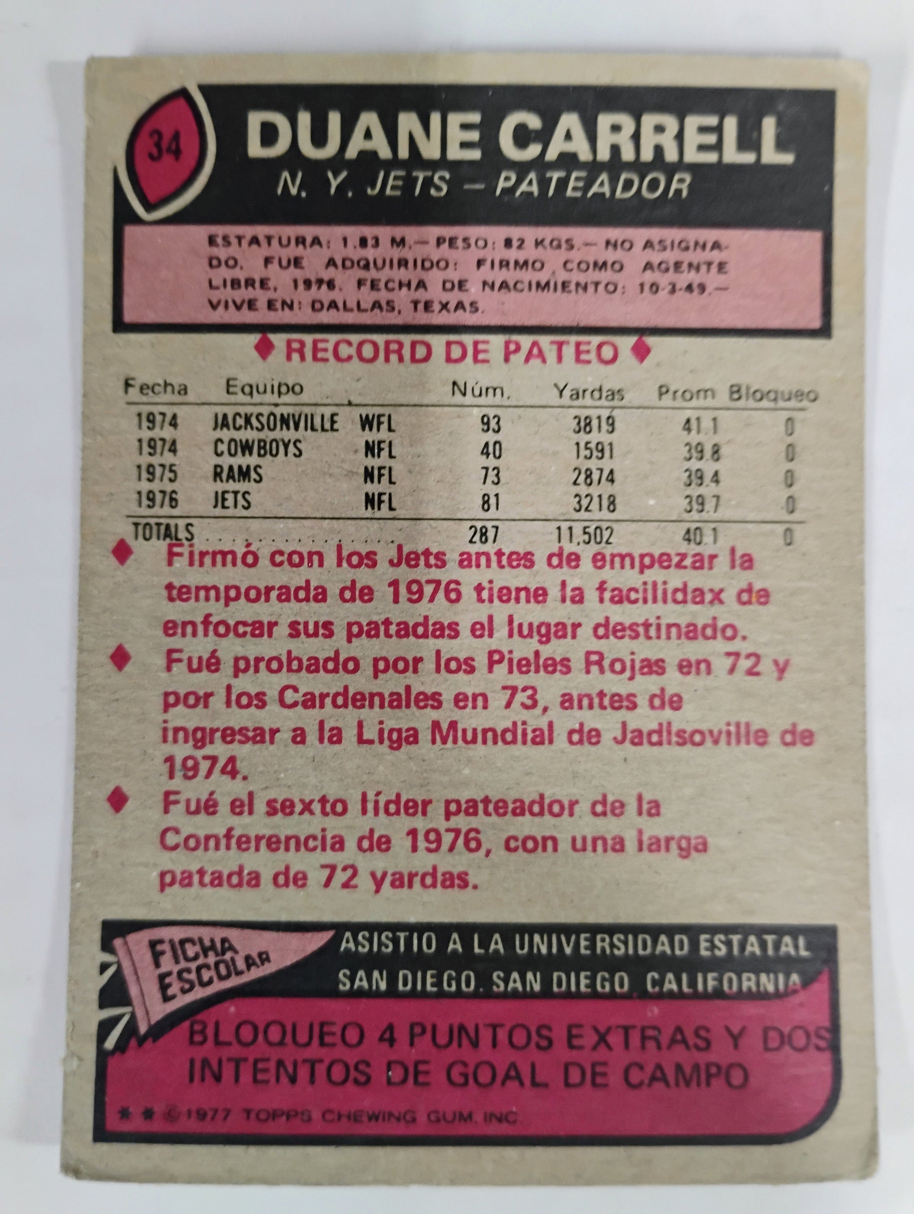 1977 Topps Mexican Football Duane Carrell #34