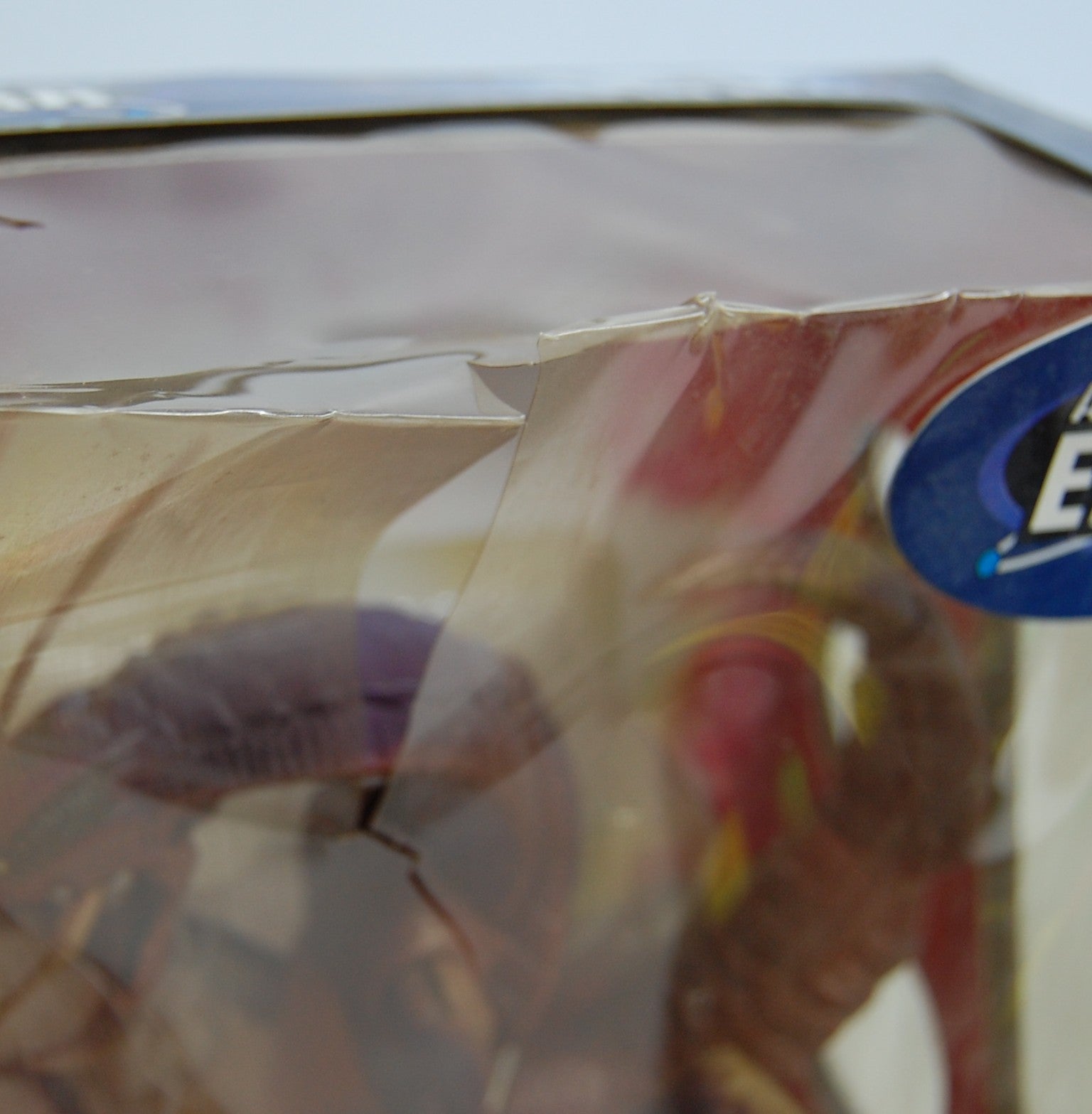 Package has obvious visual damage, plastic window has cracks, disocloration, soiling and is coming away from the cardboard at the bottom. Edge wear, corner wear, creasing as well. Figure looks great and is approximately 9 1/2 - 10 inches.