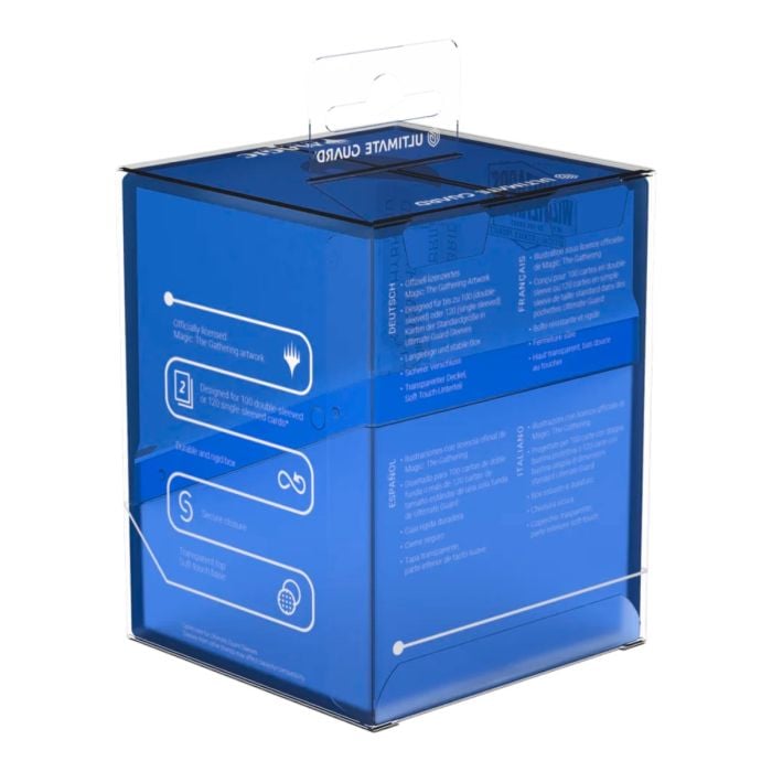 FEATURES - Officially licensed Magic: The Gathering artwork - Durable and rigid box - Designed for 100 double-sleeved or 120 singlesleeved cards in Ultimate Guard Sleeves - Secure closure - Transparent Top and Soft-Touch Base