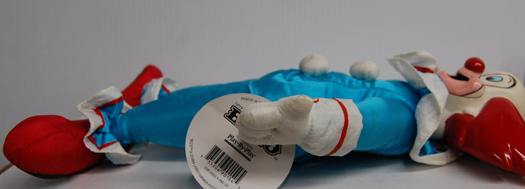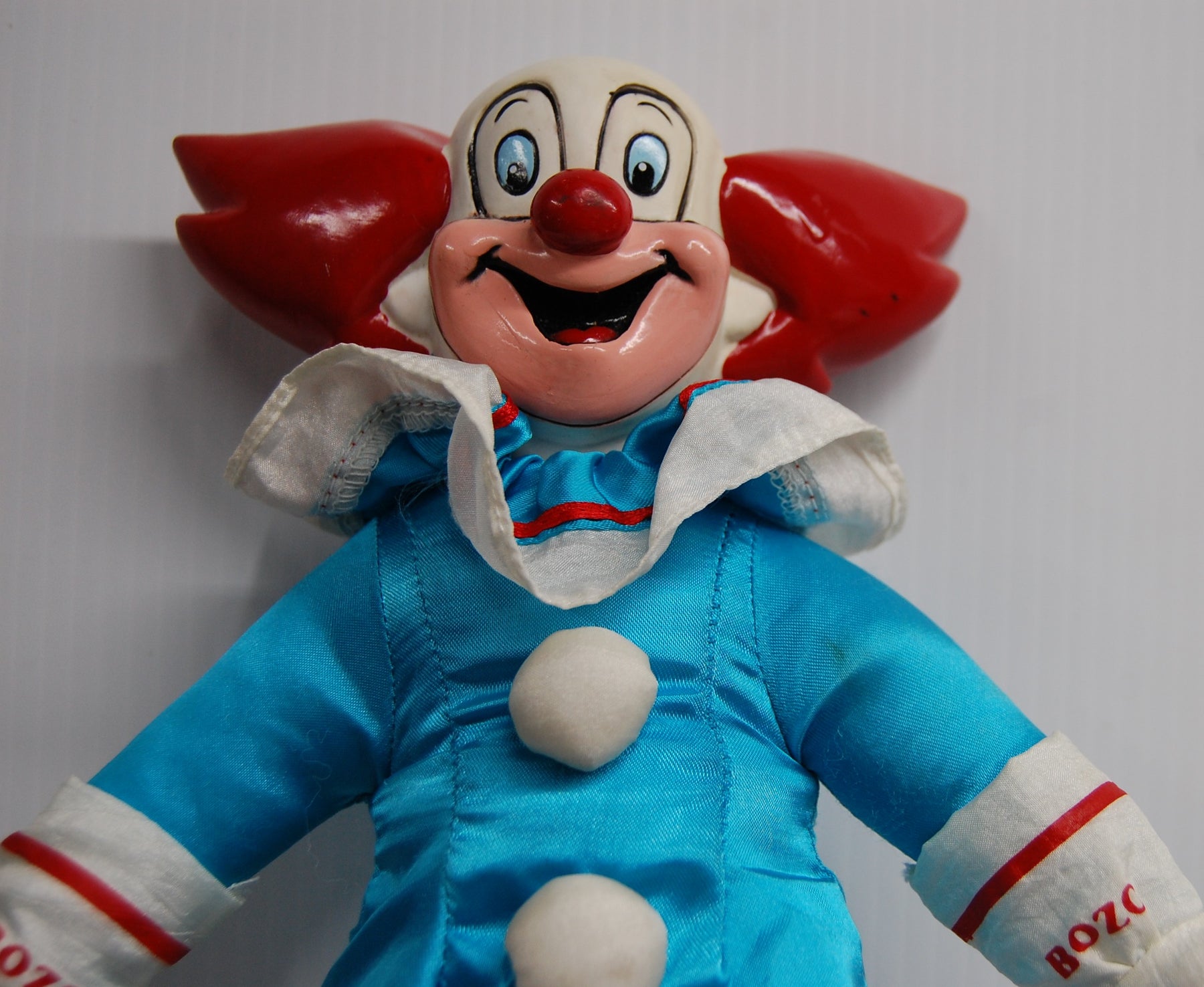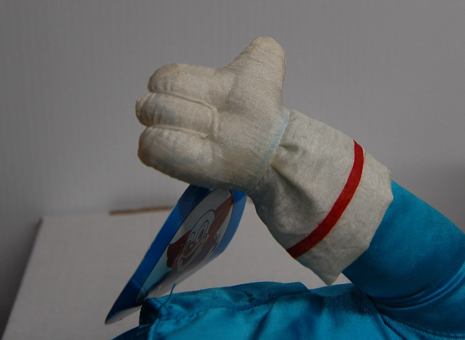 Has some spots of soiling and a couple fray threads, couple areas minor pilling, some marks and wear to head. Approximately 13 inches. Plush with rubber plastic head.