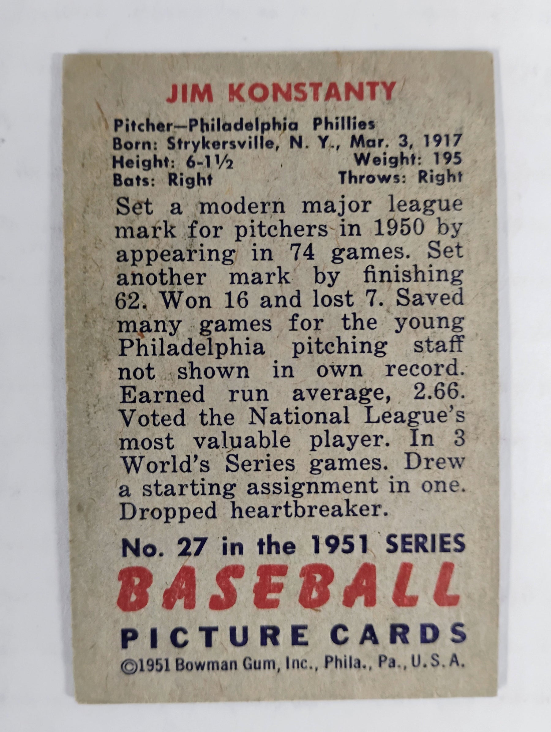 1951 Bowman Baseball Jim Konstanty #27 VG Partial Sret Break. No Creases Centered, Soft Corners, No Chipping or Fading Good Color Back is Free oF Wax Staing VG Card