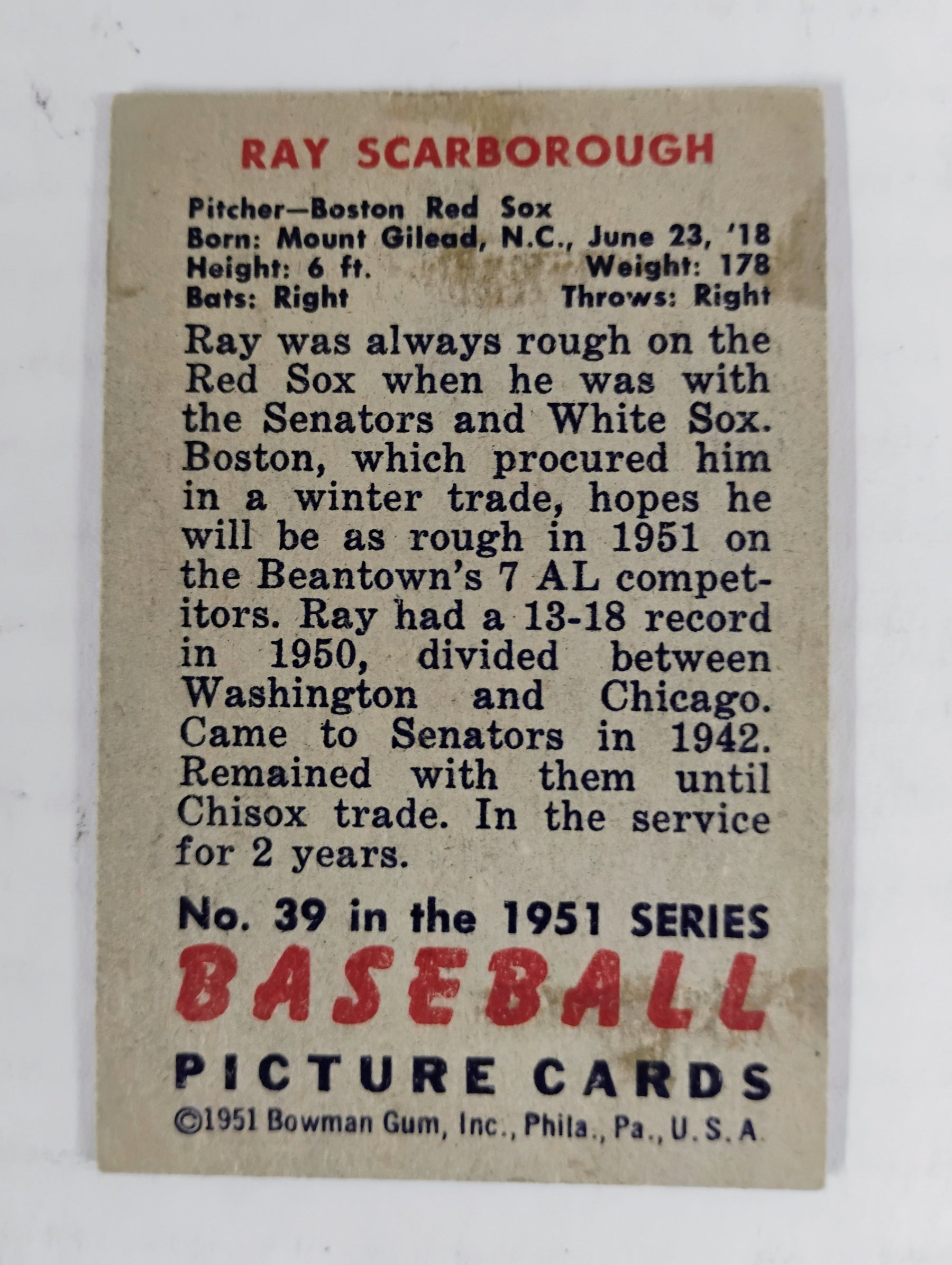 1951 Bowman Baseball Ray Scarborough #39  VG Partial Set Break No Creases Good Corners No Fading or Chipping Great Color Back Has Wax Stain