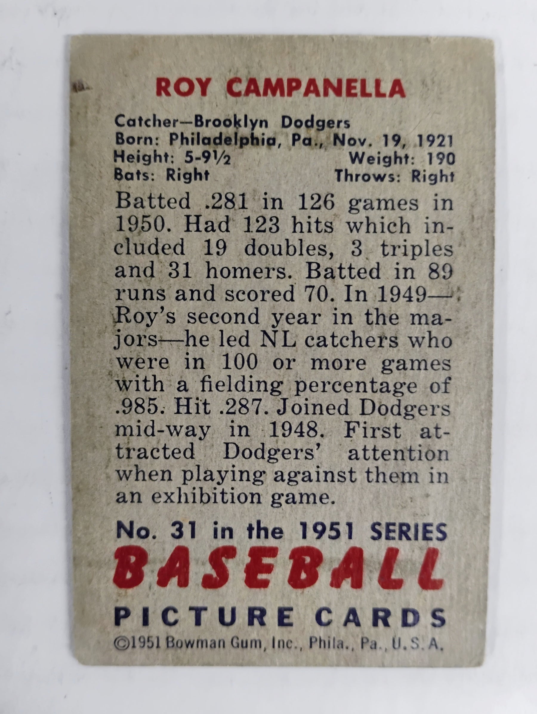 1951 Bowman Baseball Roy Campanella #31 Good Partial Set Break Crease Along the Right Side OC Soft Corners Fading On Front Wax Stain On Back